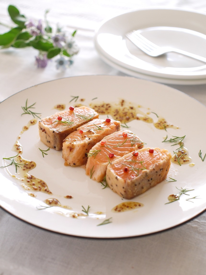 下味をつけた刺身用のサーモンを、フライパンで、表面だけ焼いてレアに。サーモンの塩気と、ハニーマスタードソースがよく合います。冷やして食べるのがおすすめ。お酒のおつまみにもぴったりです。