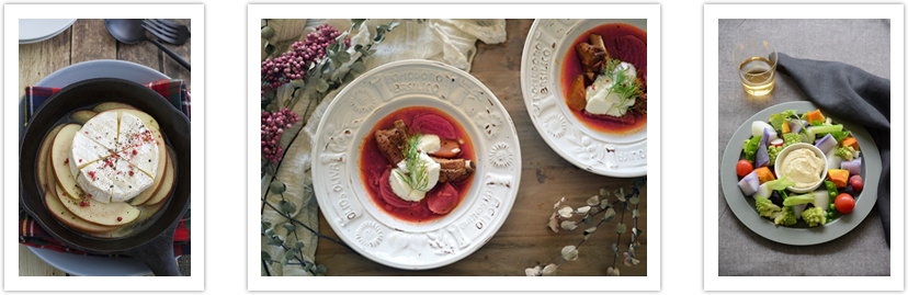 カットしてあるケーキの場合は、お皿に並べるだけでなく、ケーキスタンドのような高さがでる器に盛り付けると良いでしょう。クリスマス料理のスタイリングのポイントは、クリスマスカラーのテーマを決めて盛り付けること、さらにテーブルの中央に並べた時に、高低差を出して立体的にすると華やかなクリスマススタイルのテーブルが出来上がります。