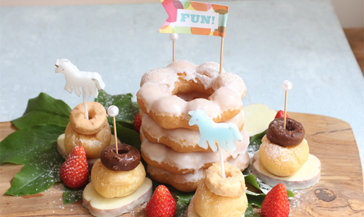 コンビニで買ってきたドーナツを誕生日ケーキのようにスタイリングするには、いくつか積み重ねて高さを出すと可愛く仕上がります。