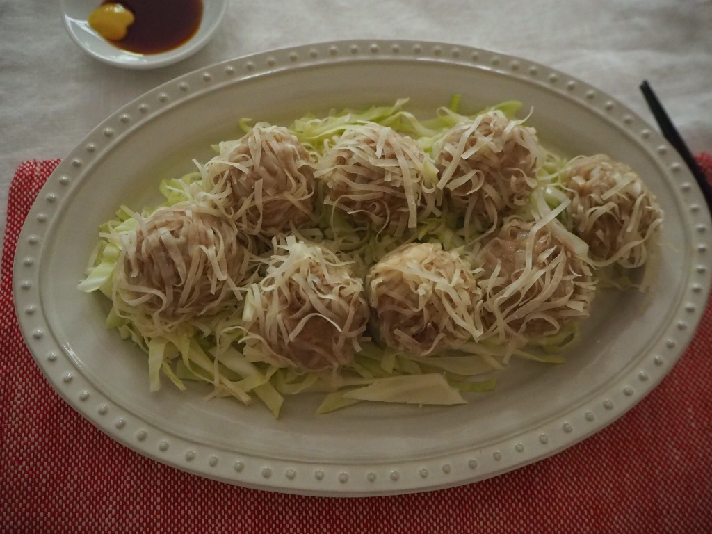 - 2を8等分程に丸め、焼売の皮を満遍なくまぶし、