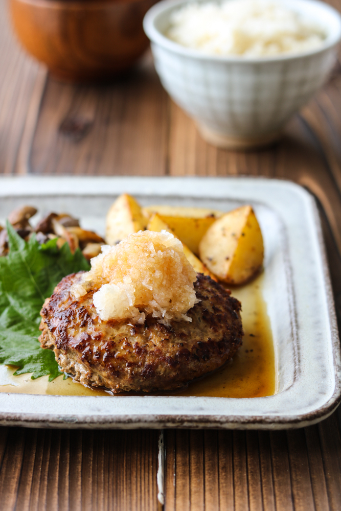 お肉の量増しとパン粉の代わりに「高野豆腐」を加えたヘルシーなハンバーグ。おろしポン酢でさっぱりといただきます。