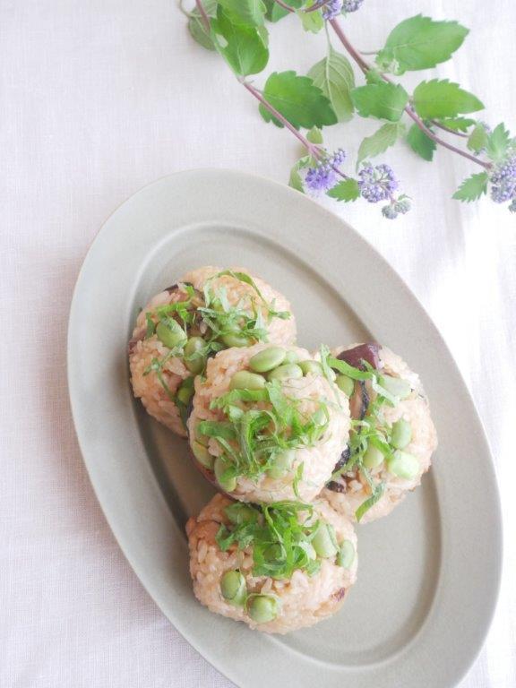 - もちとごはんを馴染ませる様に混ぜ粗熱を取り4等分にし、枝豆を加えラップで丸い形に整え器に盛り、大葉をのせる。