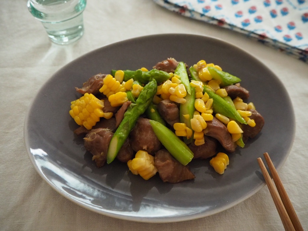 - 砂肝は銀皮をそぐようにしてとり、半分の厚みにする。アスパラガスは、硬い部分を切り落とし、下部をピーラーでむき、斜め薄切りにする。とうもろこしは包丁で実をそぐ。