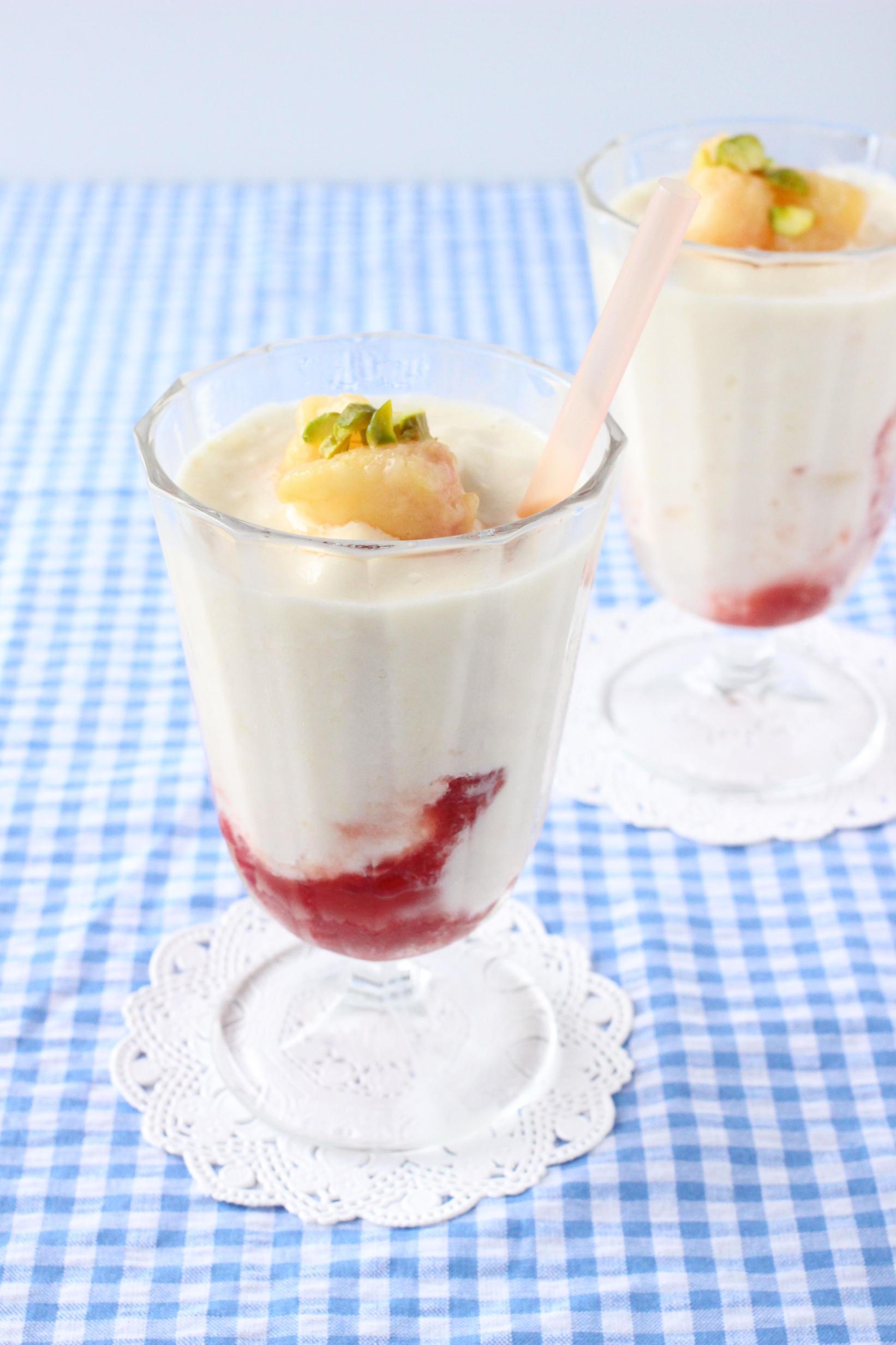 - グラスにAを入れ2を注ぎ、桃(トッピング用)・ピスタチオを飾る。