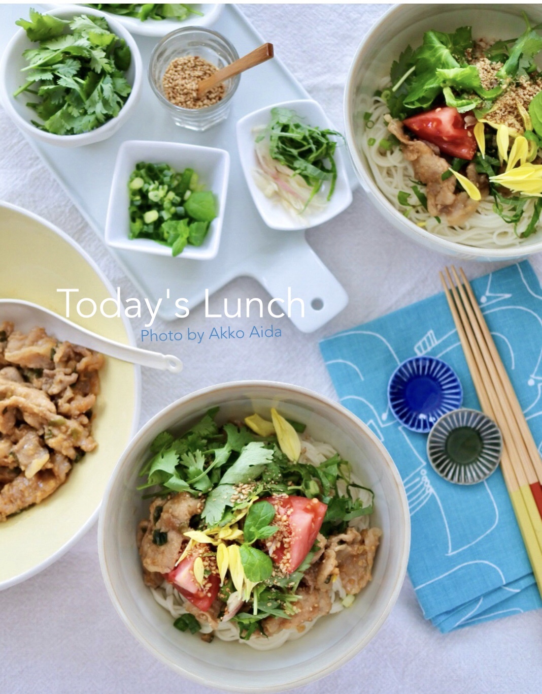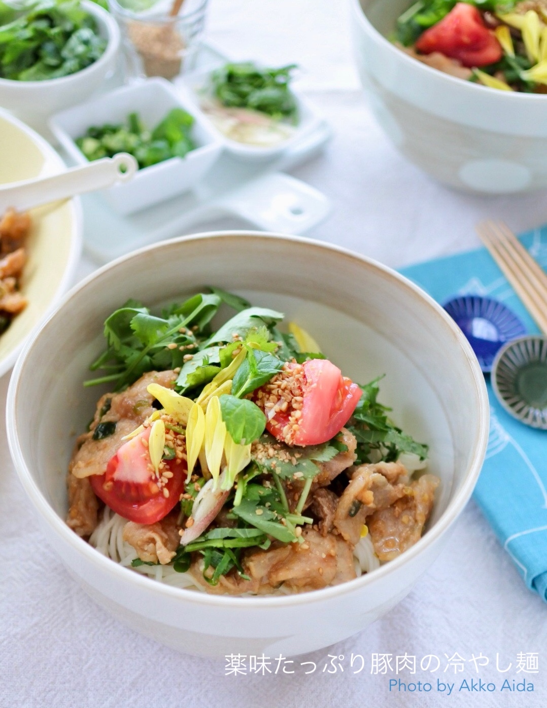 夏のお昼ごはんにぴったりな冷やし麺。そうめん、うどん、中華麺でもなんでもOK。野菜や薬味もお好みのものを色々入れて、濃いめの味付けをした豚肉とよく混ぜて召し上がってください。花椒パウダーや辣油を効かせると更においしく!