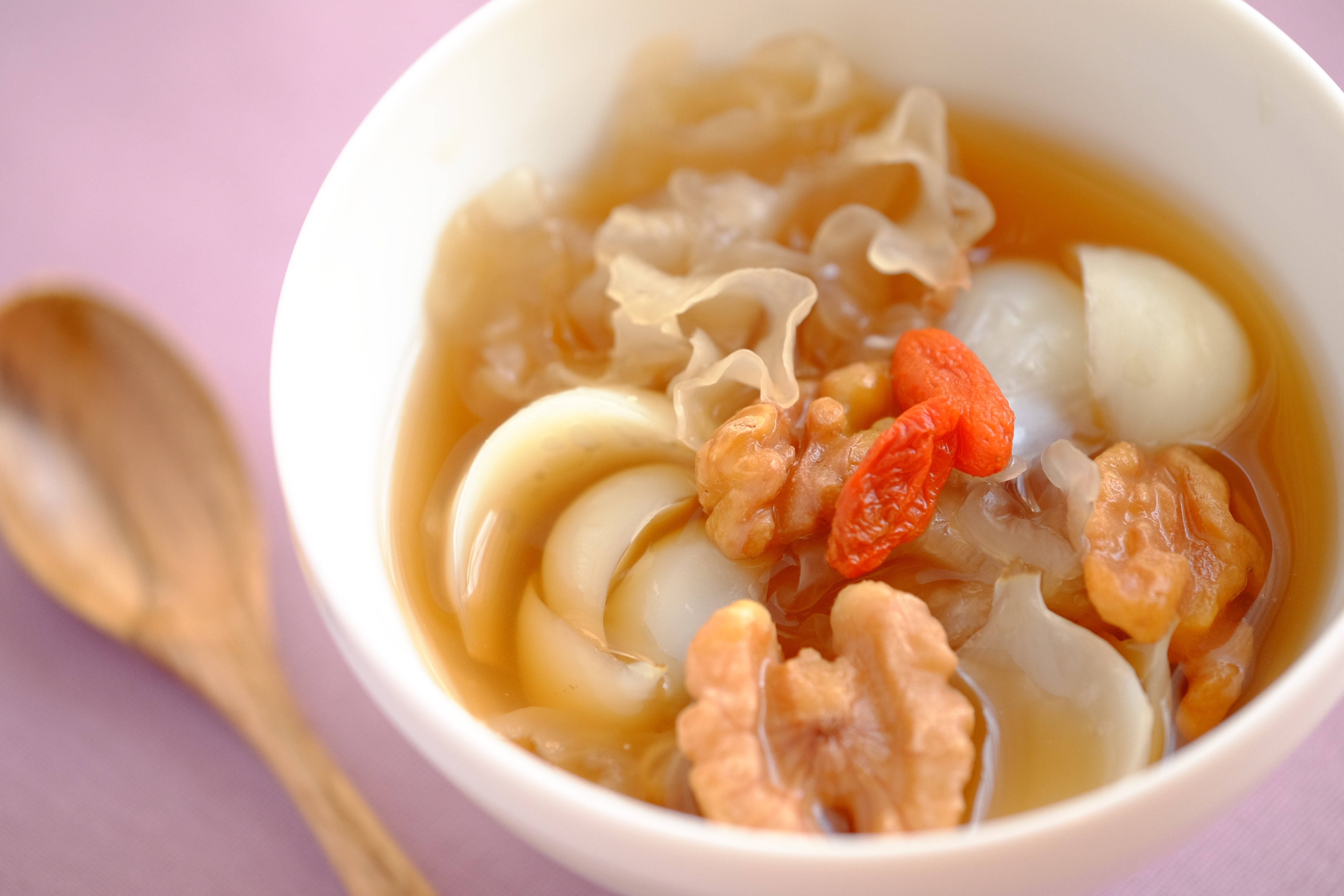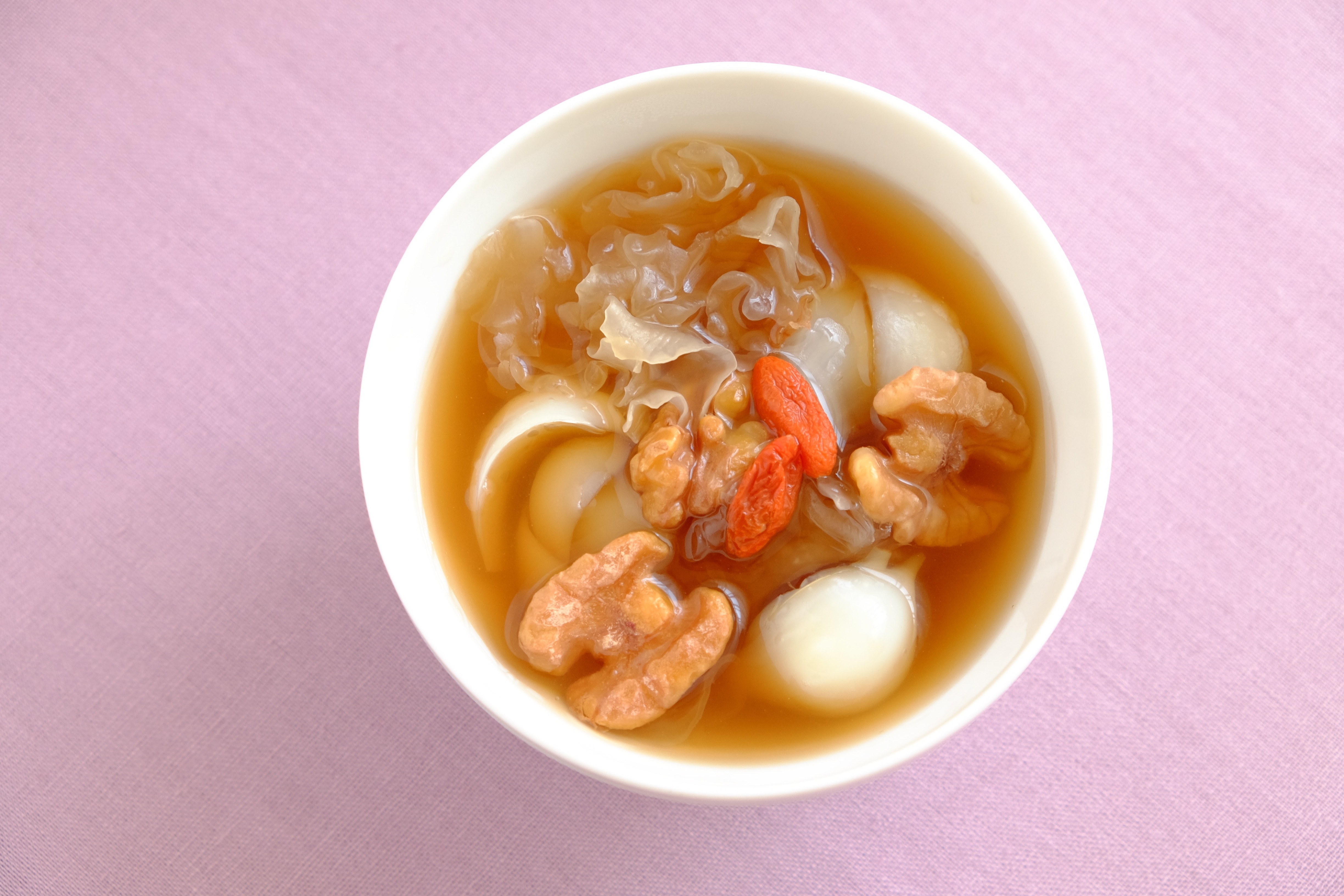 煮るとつるんとした食感がおいしい白きくらげ。くるみやくこの実とともに黒砂糖で煮込んだ、あたたかいデザートです。