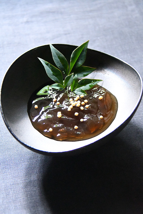 - 鍋に[1]を茶こしで濾しながら注ぎ、寒天を加え、火にかけて混ぜ、沸騰したら、吹きこぼれない程度に沸騰が保たれる火加減にして2分、混ぜながら煮溶かす。弱火にして素焚糖を加えて混ぜ、火をとめる。