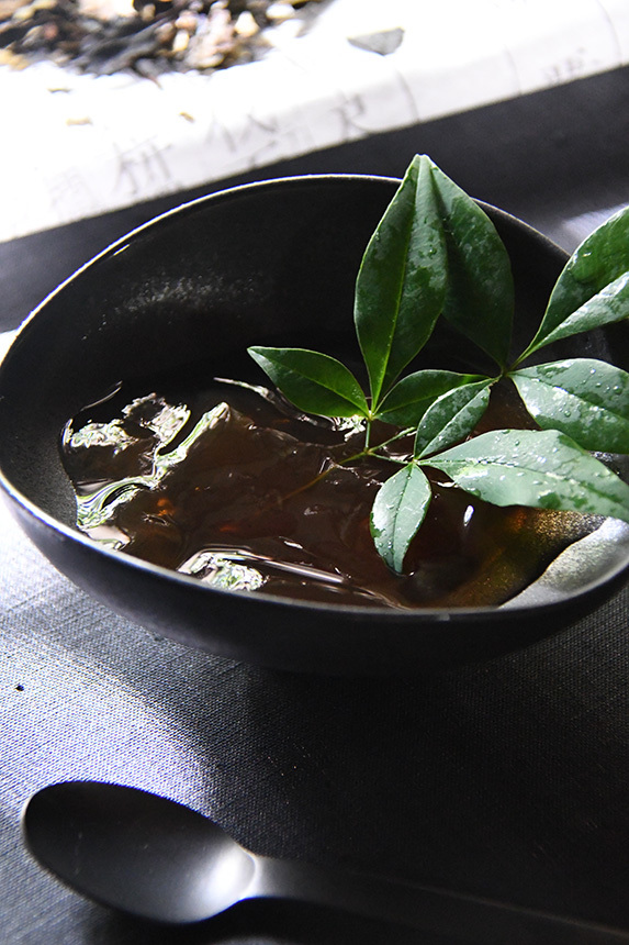 *ぜひ、いり番茶の味わいを生かしたシンプルなとろり寒天で涼んでください。お好みで、ぶぶあられをトッピングして頂くのも楽しめます。