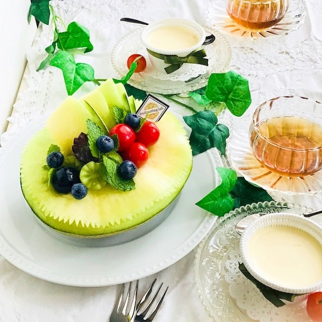 ギフト用のデコレーションされたメロンとコンビニのレアチーズケーキを使いました。高価なメロンと手軽なコンビニスイーツをバランス良く見せるために、リボンを使ってスタイリングしました。