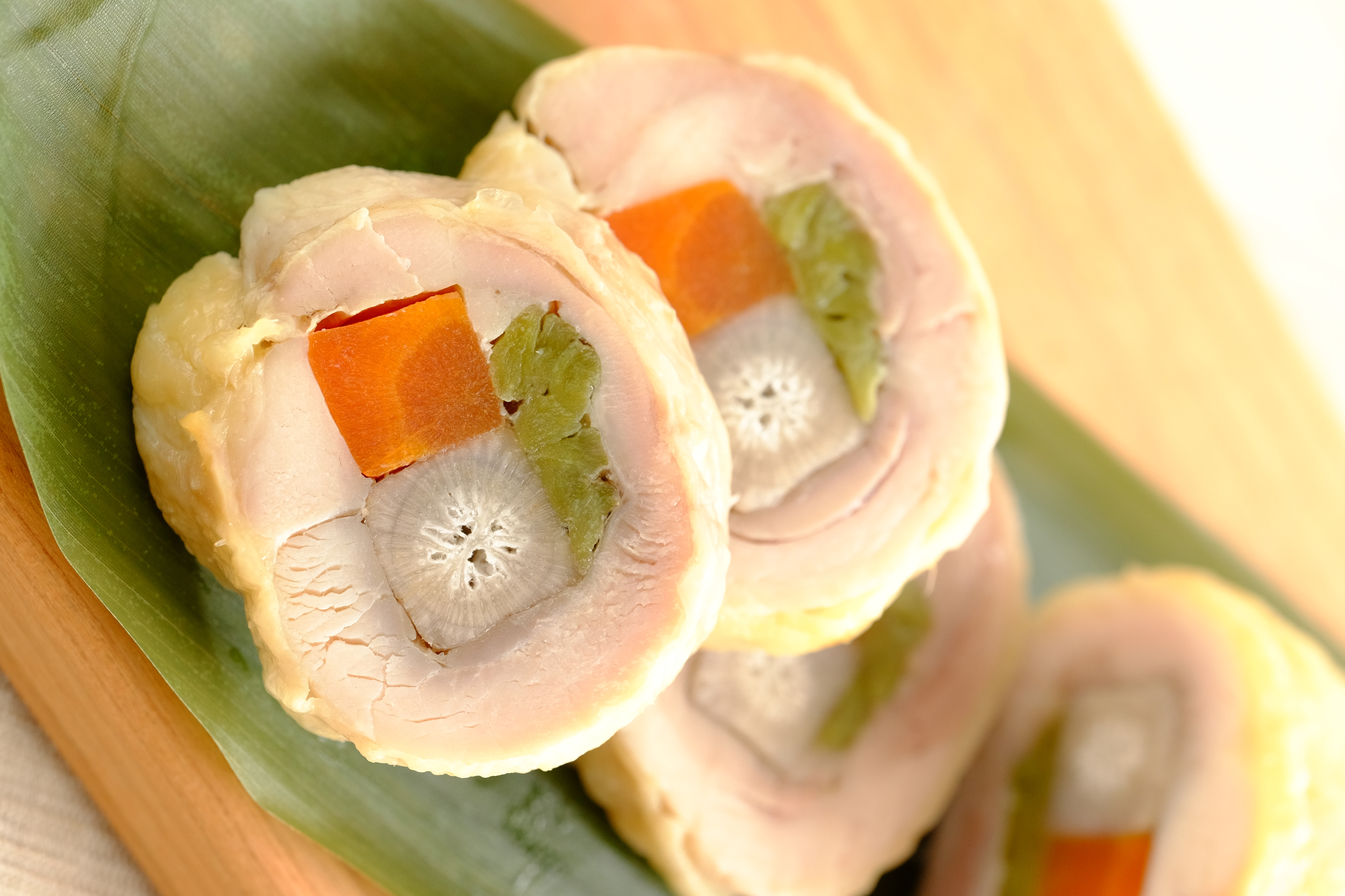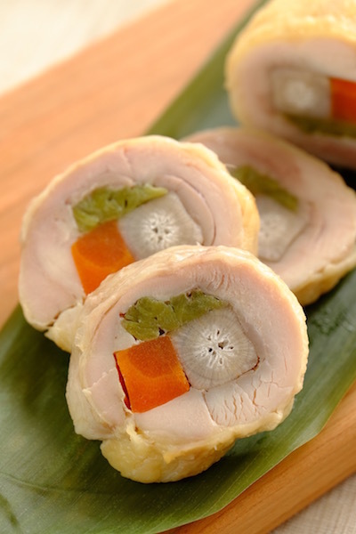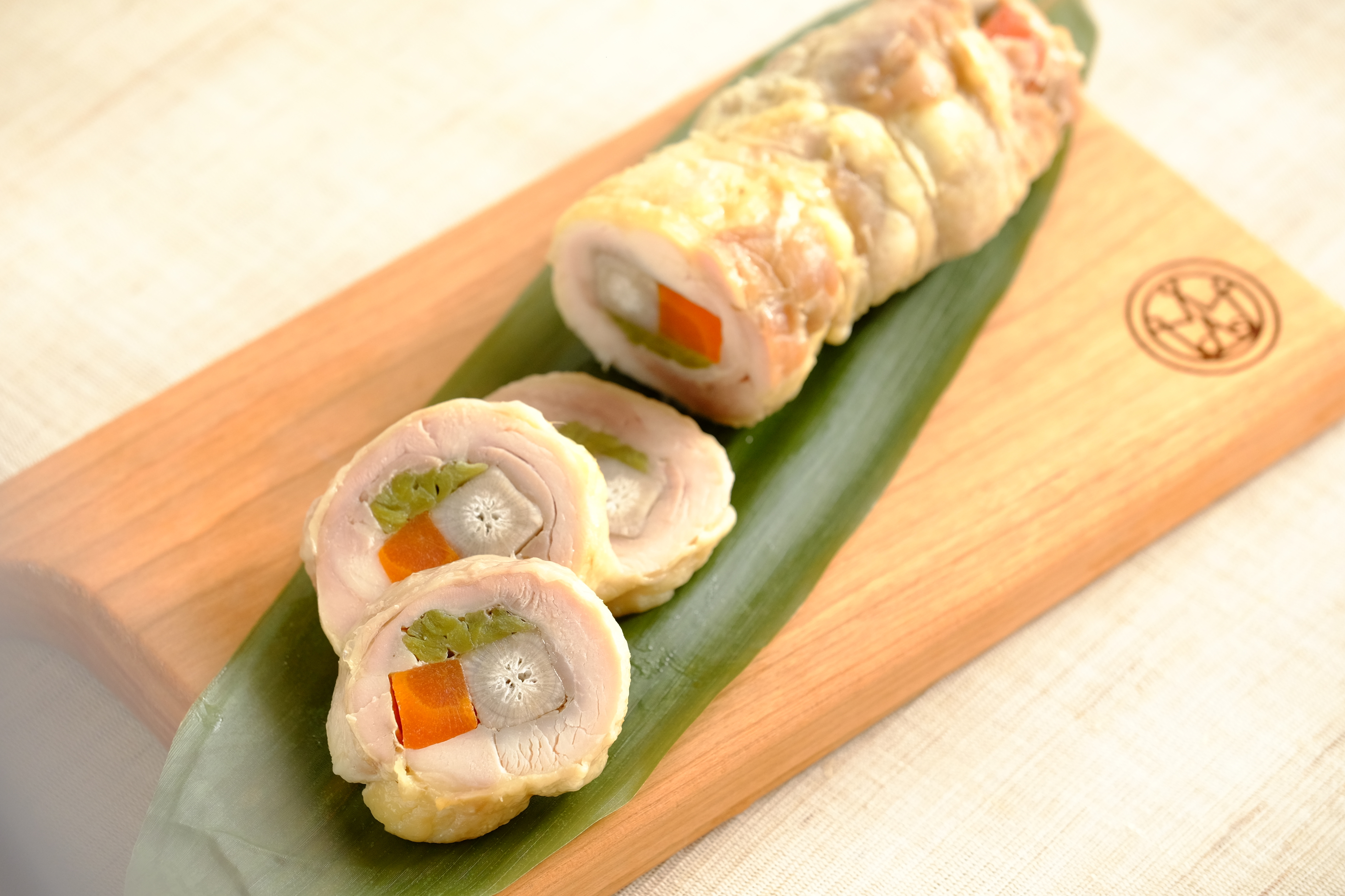 - 鶏肉の皮を下にし、内側になる部分に昆布茶の粉末を振り、にんじん・ごぼう・山ごぼうを置いて、巻く。タコ糸を巻きつけ、クッキングペーパーで包む。(タコ糸がないときは、アルミホイルで巻き、両端をねじって止める)。