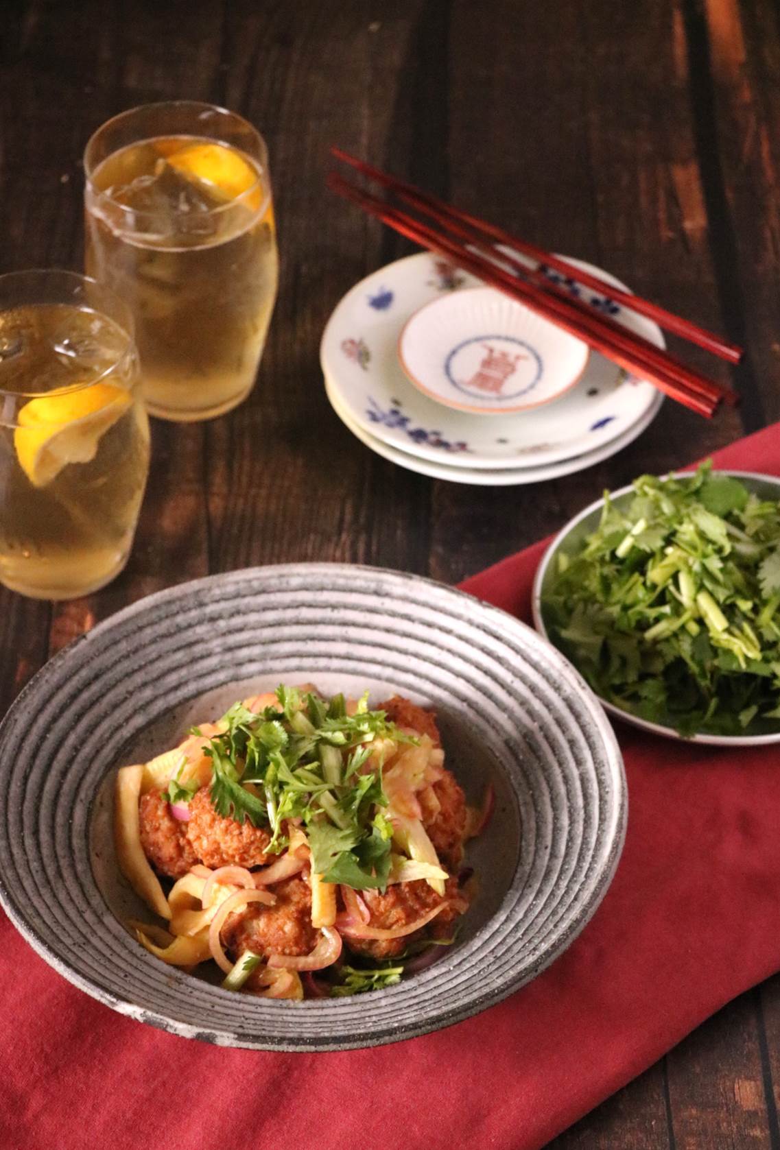 豚ひき肉を使った山椒香る南蛮漬け。醤油の代わりにナンプラーを使えば、エスニックな味付けに。冷めてもおいしく、おもてなしにぴったりの一品です。