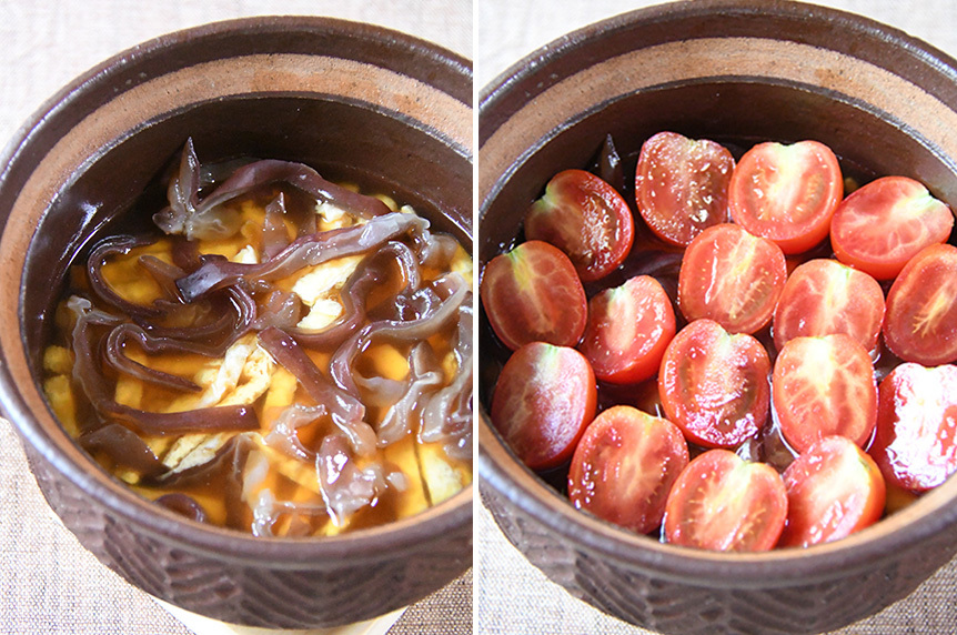 - プチマトはヘタを取り縦半分に切る。きくらげは水で洗い水気を取り5mm幅に、油揚げは湯通しをして縦半分に切り横にして5mm幅に切る。小ねぎは小口切りにする。