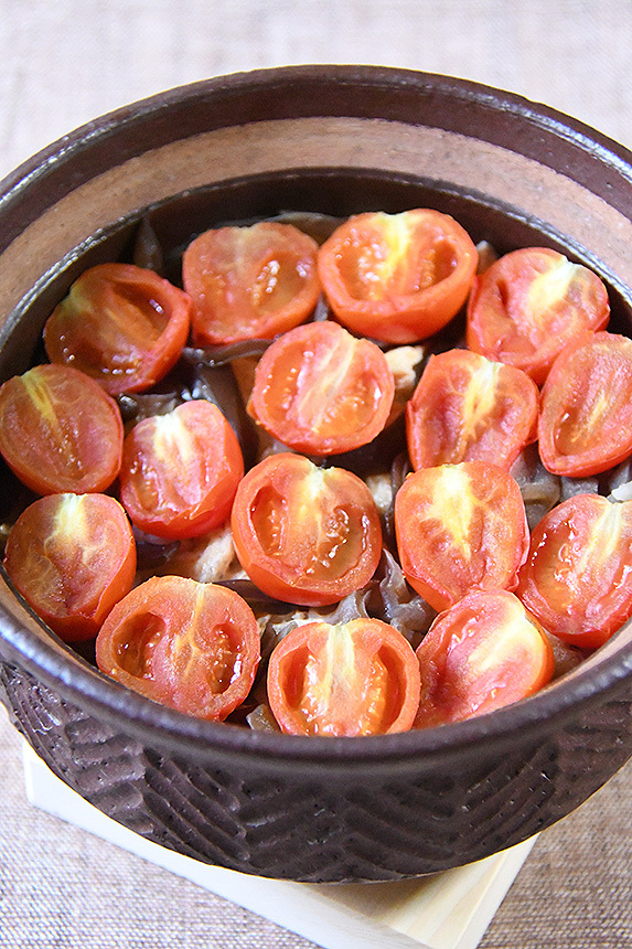 [1]に、油揚げ、きくらげ、プチトマトの順に加えて炊飯する。