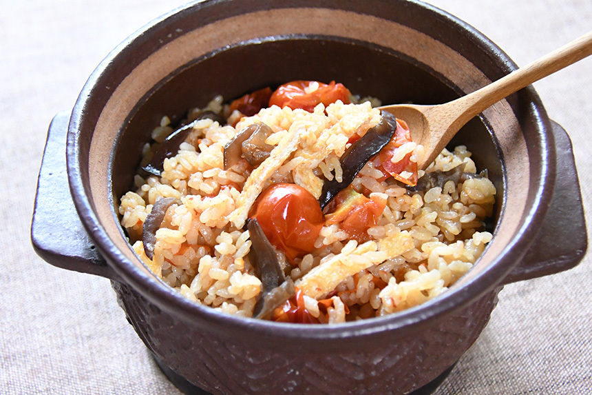 プチトマトの彩りときくらげの食感が楽しい炊き込みご飯です。