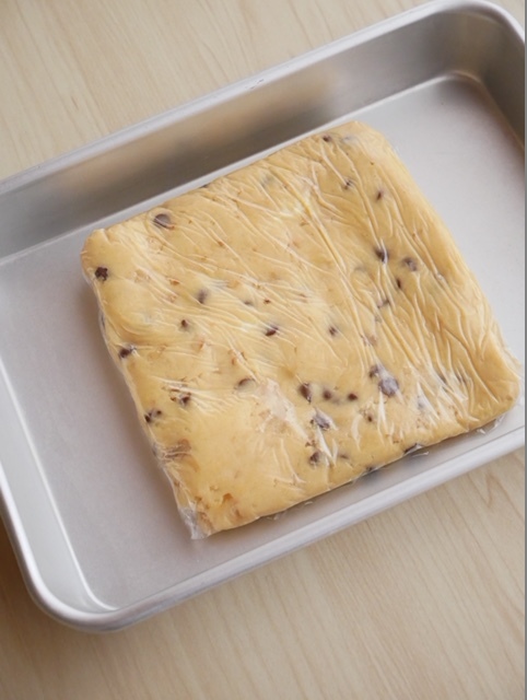 チョコチップとくるみを入れ均一に混ぜ、12cm角位の四角に形を整え、ラップに包み、冷凍庫で15分休める。