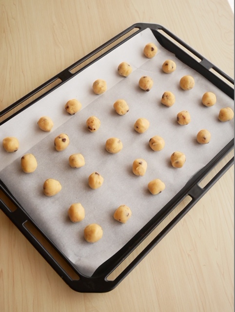 しっかり生地が冷えたら、包丁で30等分し丸めて、天板にのせ、