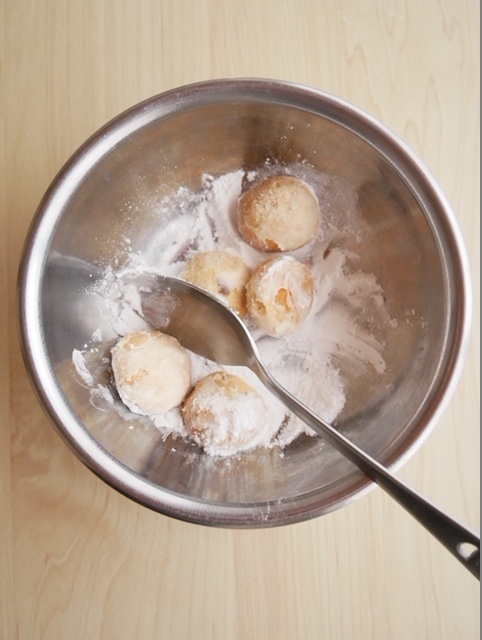 粗熱がとれ、少しぬくもりがあるうちに、溶けない粉砂糖をボウルに入れ、6をスプーンを使ってからめて、仕上げにきなこを茶こしでふるう。