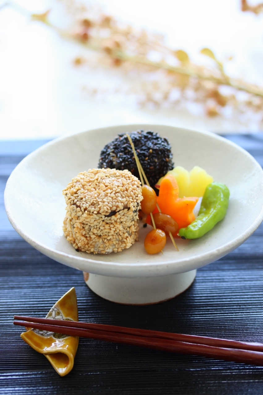 - 卵白をよくとき、②をくぐらせ、2つを白ごまに、もう2つを黒ごまにまぶす。