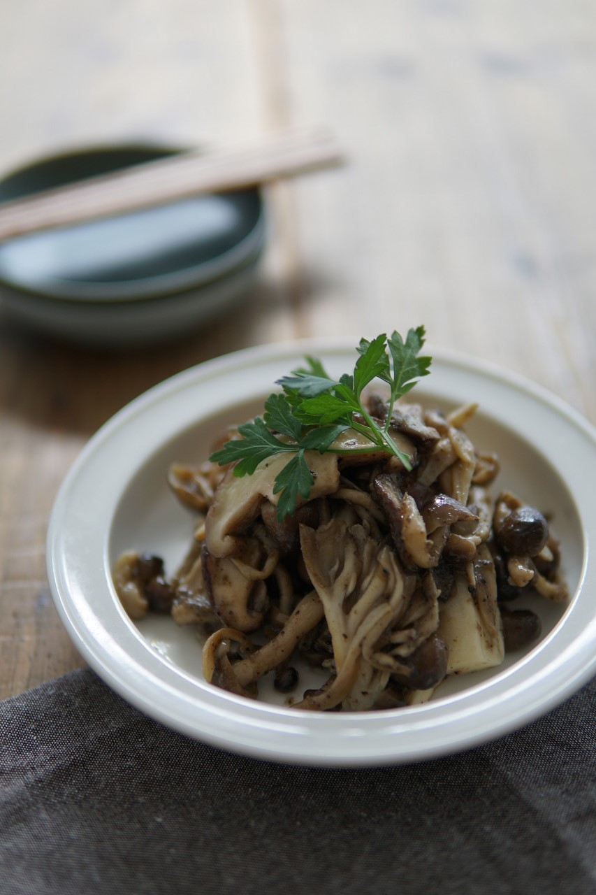 - フライパンにサラダ油を熱し、マッシュルーム、しめじ、舞茸を強火で焼き色がつくまで炒める。