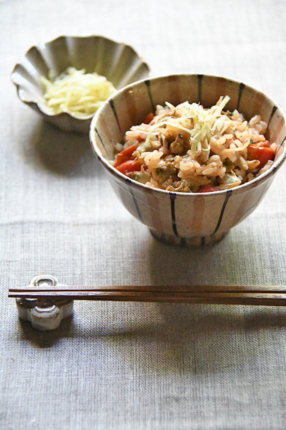 - [3]のプチトマトをスプーンでほぐしながら全体を混ぜ、器に盛り、生姜を添えて頂く。