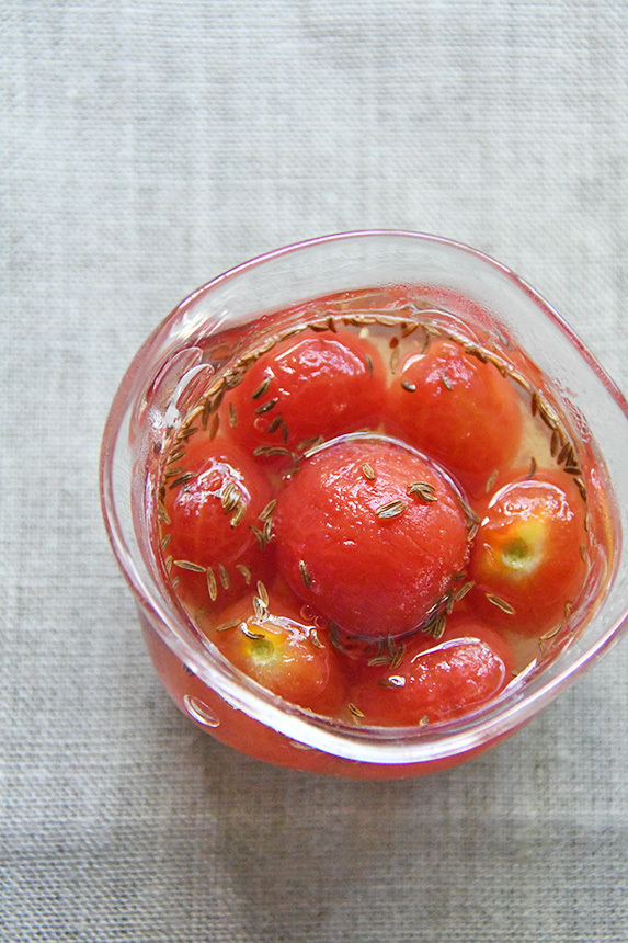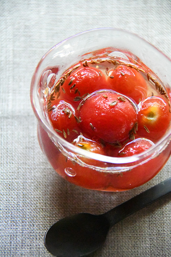 - ボールにすし酢とハチミツ、キャラウェイシードを入れて混ぜ、[1]のプチトマトを加えて和え、器に盛る。