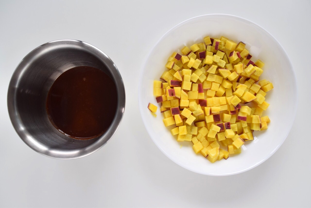 水を切ったサツマイモを耐熱容器に入れ、ラップをかけて600W2分〜2分30秒加熱し、キャラメルソース大さじ1を合わせておく。