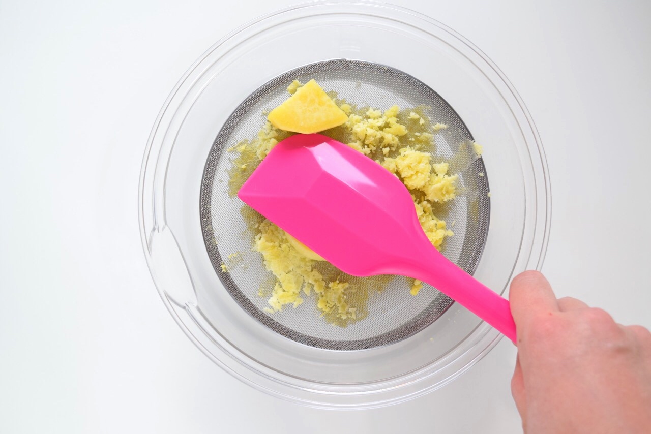 サツマイモをこす場合は、細かめのザルやこし器で木べらを使うと力が入りこしやすいです。