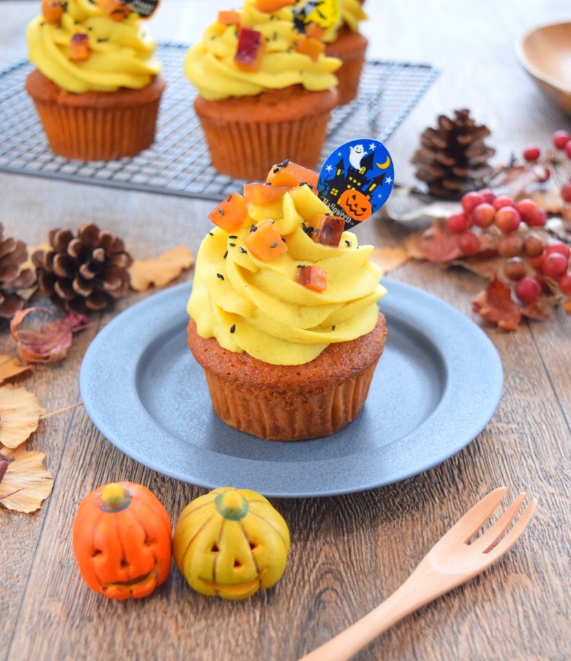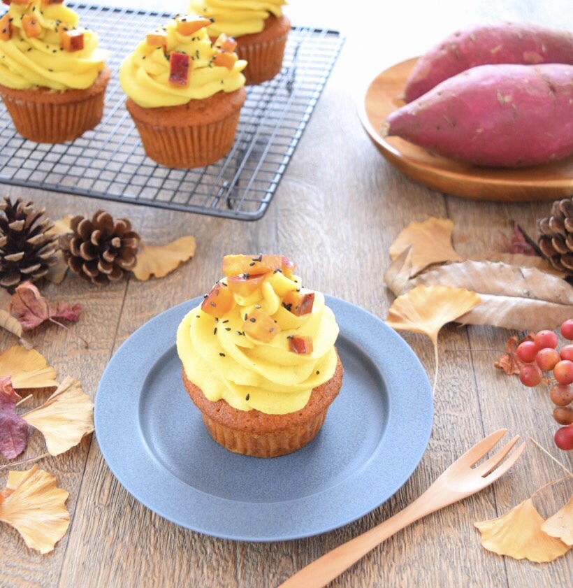 旬のサツマイモをたっぷり使ったカップケーキに。相性の良いキャラメルソースでちょっぴりほろ苦に。ハロウィンパーティーにもオススメです。