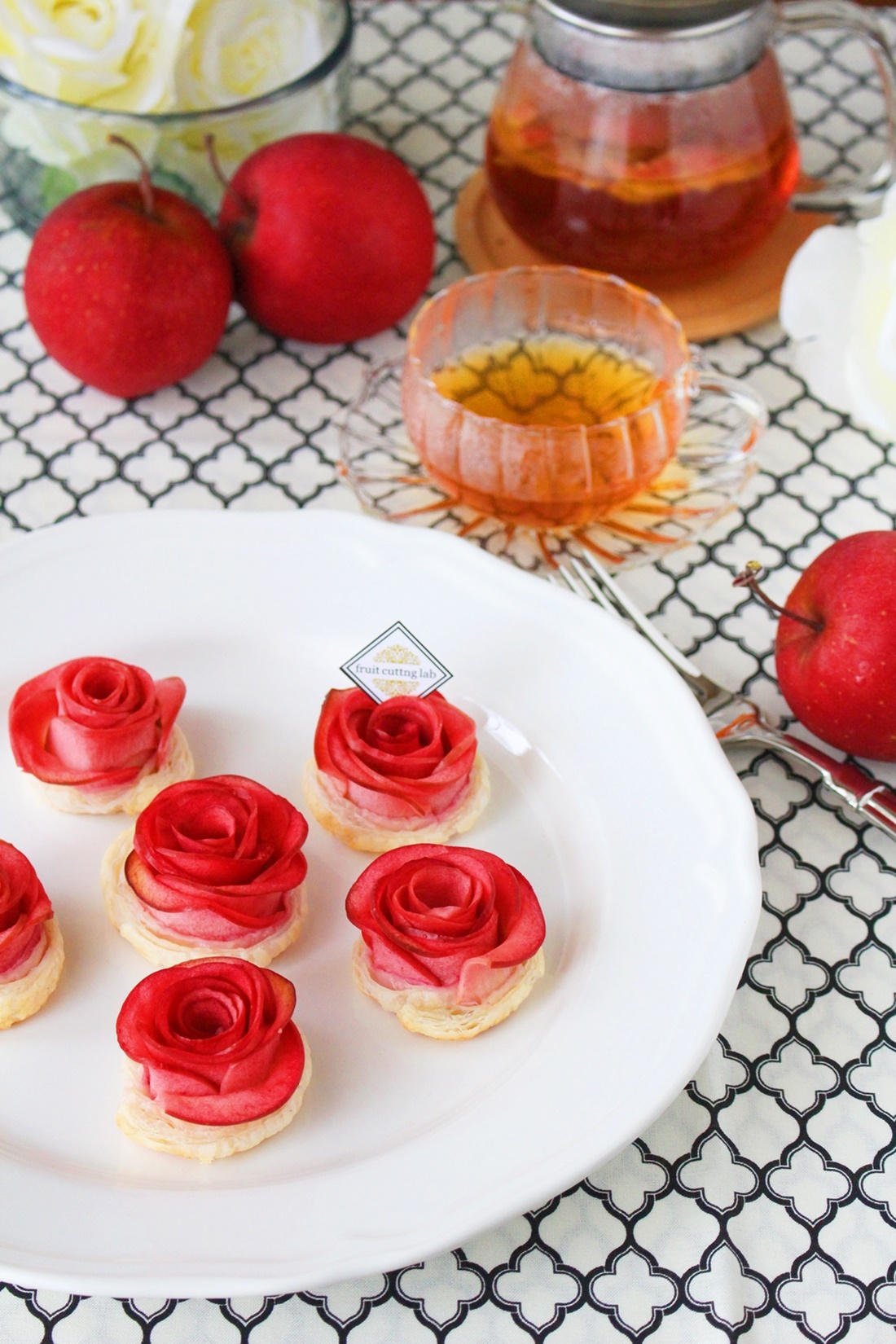 果肉の赤いリンゴのローズパイを使ってスタイリングしています。生のリンゴを入れることで、手作りしたものをティータイムでいただくイメージです