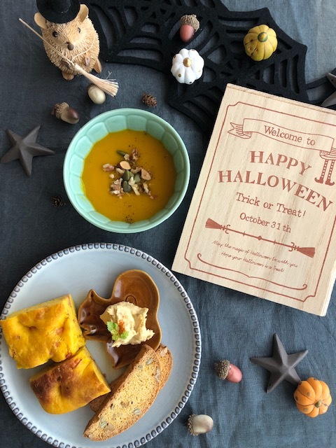 ハロウインと言えば、かぼちゃなので、それをそれぞれに取り入れたワンプレートに仕上げました。 ワンプレートに数種類盛りつけると、見た感じ、楽しくおしゃれに見えます。 小物はハロウインで統一しました。