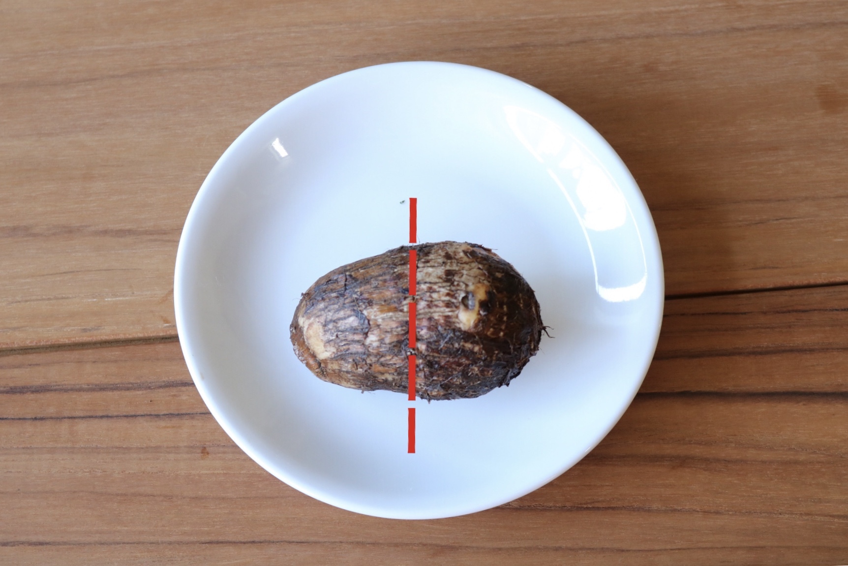 里芋は洗い泥を落とし、1周切り込みを入れる。耐熱皿に並べてラップをかけ、電子レンジ600wで7分ほど加熱する。
