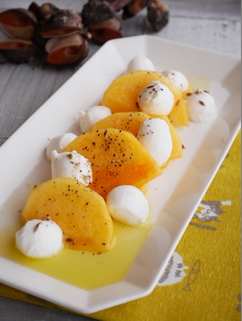 - 柿は食べやすい大きさに切り、モッツアレラチーズは半分に切る。