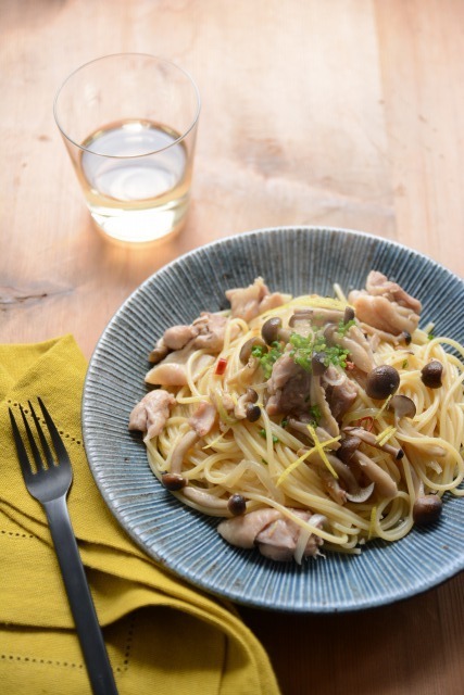 鳥もも肉に火が入ったら、スパゲッテイの茹で汁を加え、油と乳化させる。