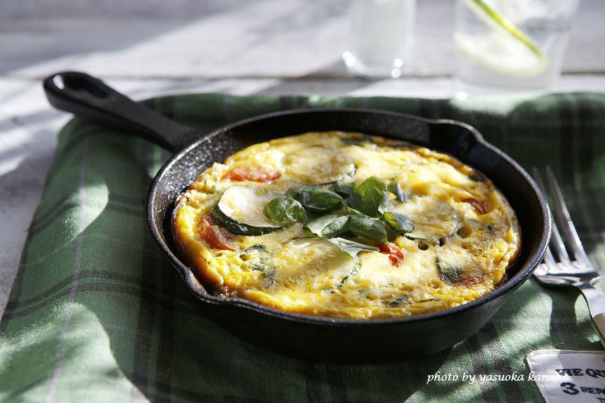 キヌアの食感がたのしいフリッタータ。スキレットでつくってそのまま食卓にだせば、忙しい朝でも手早く用意できる朝ごはんに。※材料は6インチ(15cm)のスキレット1台分です。