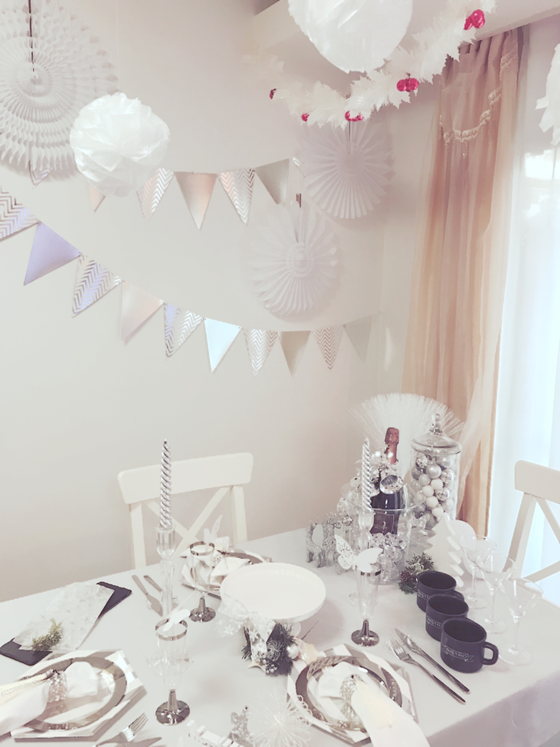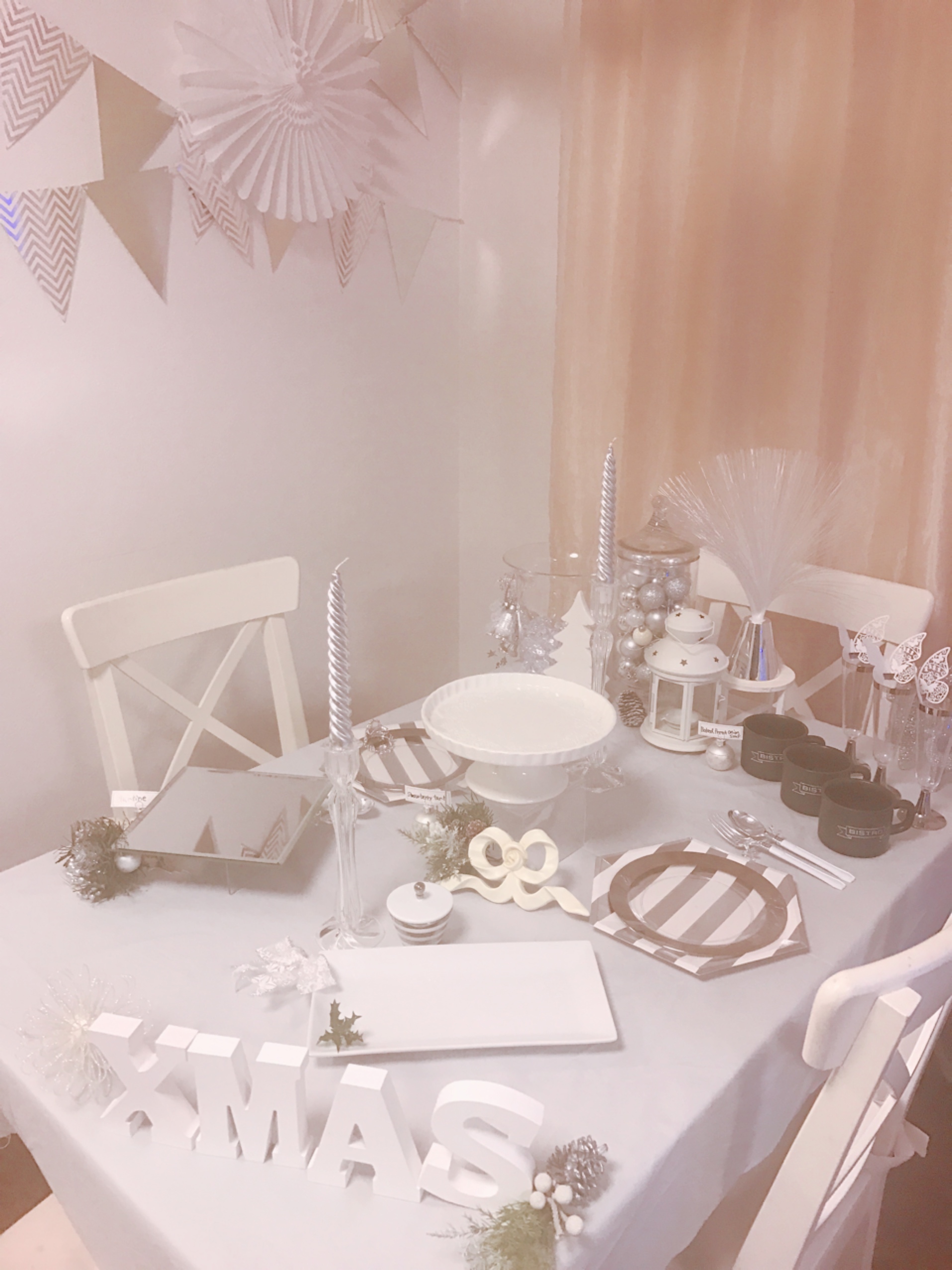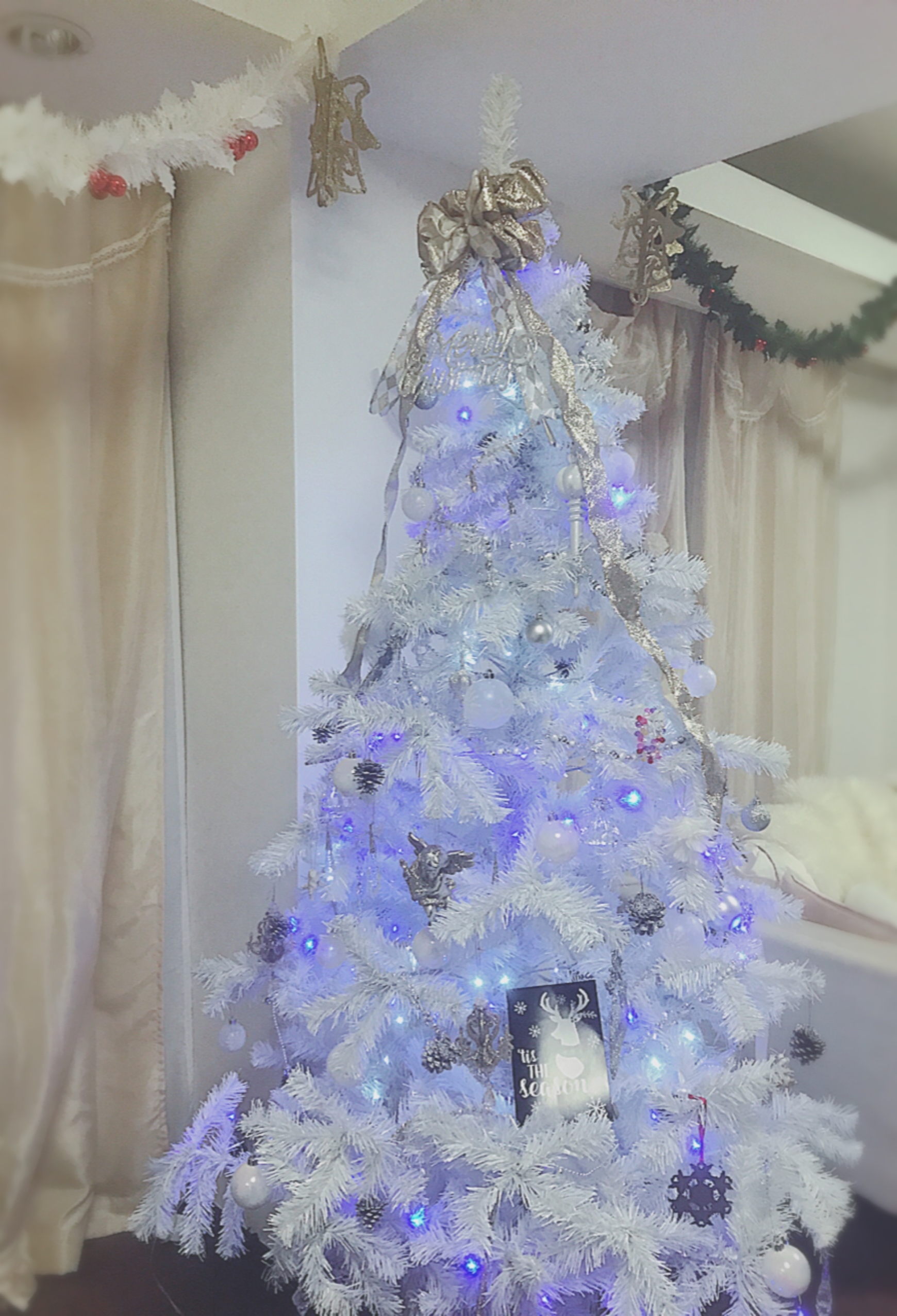 白いクリスマスツリーに合わせて、テーマカラーはシルバーと白をテーマでコーディネート。
