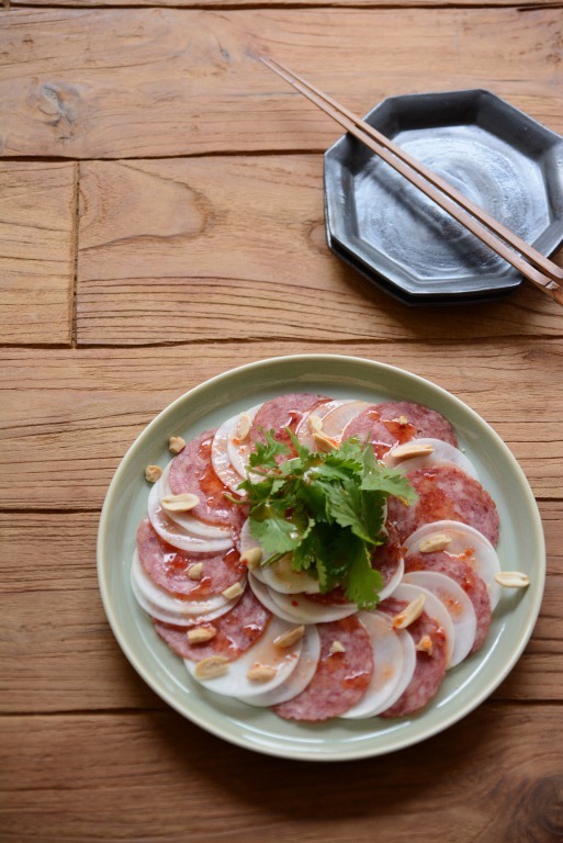 - 器にかぶのスライスと、サラミを盛り付け、2をかける。