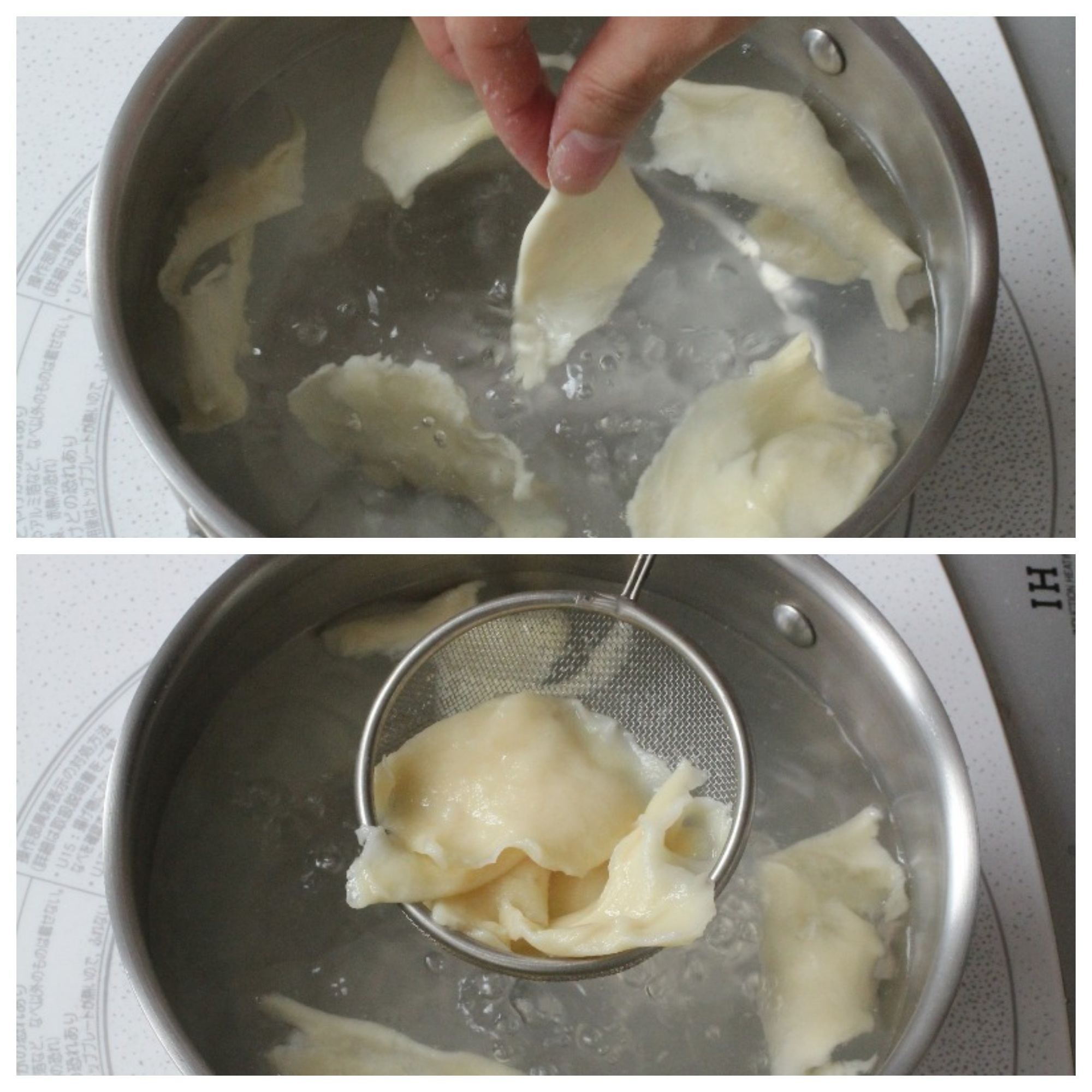 別の鍋に湯を沸かし、寝かせた生地を手で薄く伸ばしながらちぎって入れていく。手に生地がくっついてしまう時は手を水で濡らすと良い。