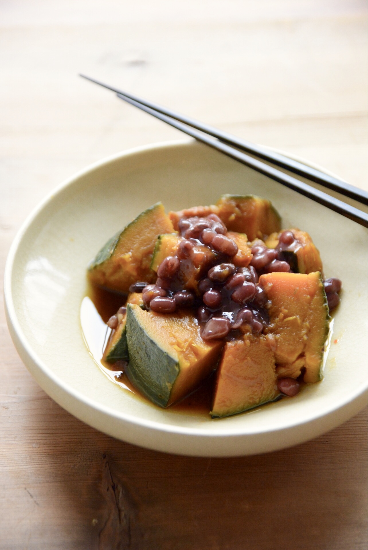 - 鍋に工程2のかぼちゃを皮が下になるように入れ、水を加え竹串がすっと通るまで煮る。そこに工程1の小豆を加え、醤油、砂糖、塩を加え10分程煮る。