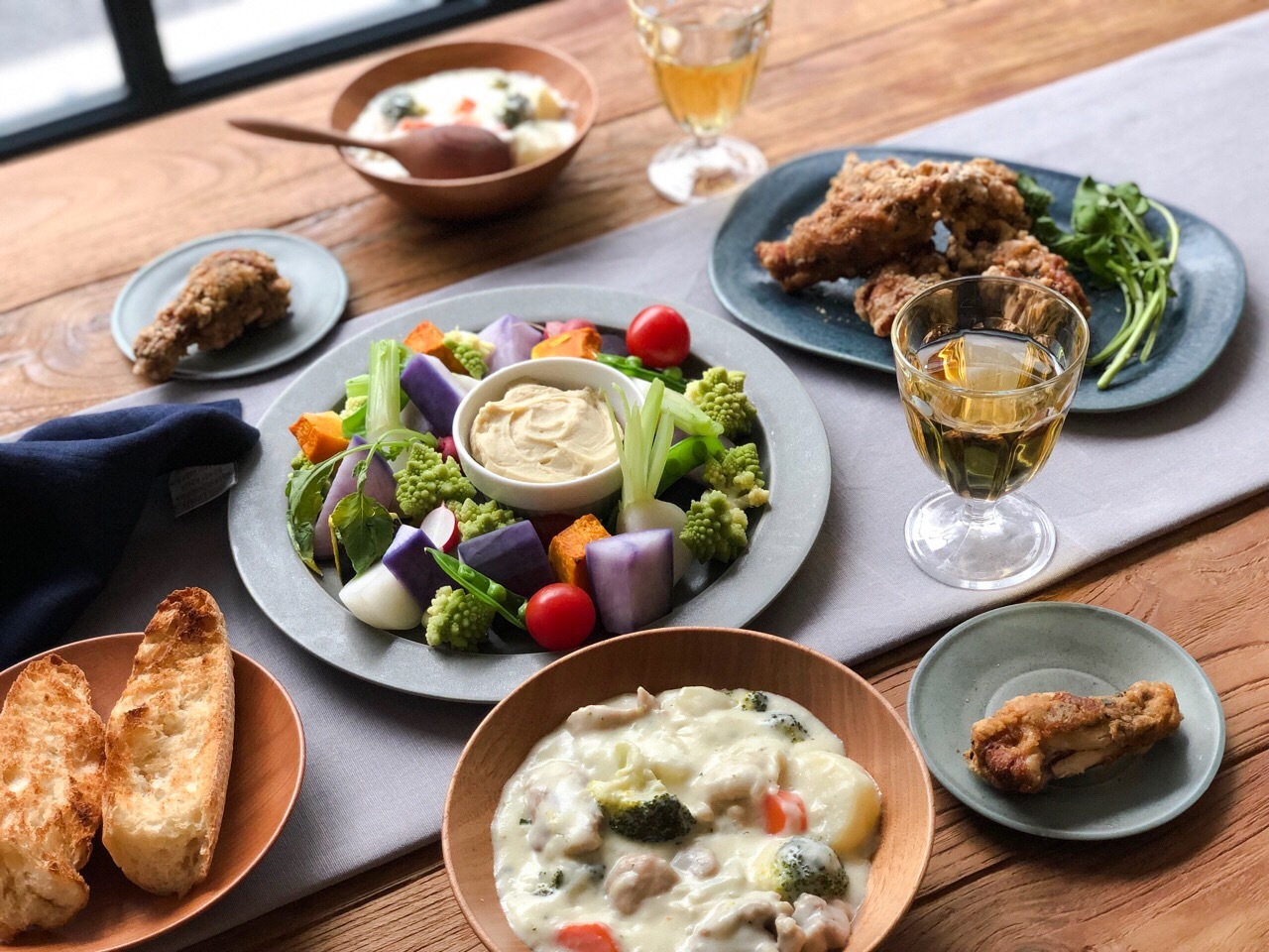 彩り野菜が映えるように、少し暗めの同系色のクロス、お皿を使いました。大人のクリスマスを意識したスタイリングにしました。