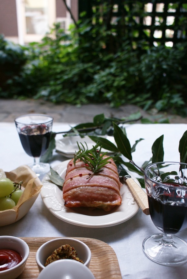 - アルミホイルを広げ、ベーコン、肉だねをのせてベーコンを巻きつけ、アルミホイルに包む。200度に熱したオーブンで20分焼く。