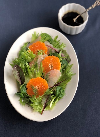 - みかんは輪切りにする。鯛は薄くスライスする。フリルレタスは食べやすい大きさに手でちぎり、ディルは葉先を摘む。