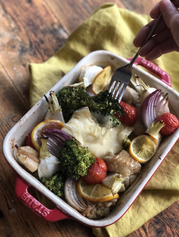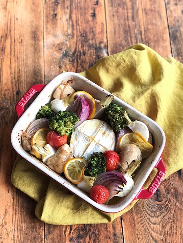 - 耐熱皿にカマンベールと鶏肉、野菜、レモンスライスを並べ、Aの漬け汁を全体に回しかけ、オーブンで30~40分ほど焼く。途中焦げそうな場合はアルミホイルをかぶせる。