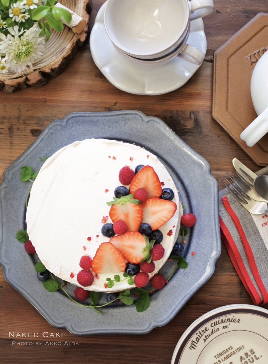 スポンジケーキの側面が茶色く見えるように、クリームは薄く透けるように塗ります。 少しまだらになるように塗ると良いでしょう。 フルーツはお好みのもので飾ってください。 いちごのサイズが大きすぎる場合はバランスが悪くなるのでカットして、断面を見せたり、葉っぱをつけたままにすると可愛くなります。 ネイキッドケーキのポイントは側面なので写真を撮るときは、よく見えるように横から撮るとおしゃれに見えます。 お皿にフルーツやハーブを飾っても可愛いです。 カジュアルな感じのテーブルコーディネートがよく合います。