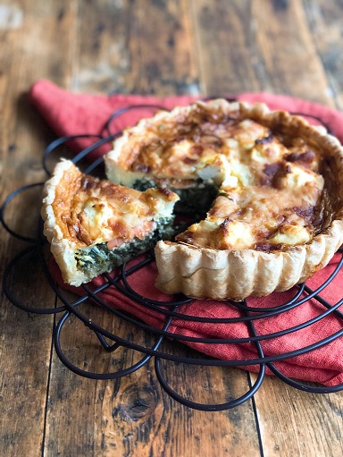 パイシートを敷きこんだ型に、炒めた玉ねぎ、春菊、スモークサーモン、クリームチーズを順に重ねる。