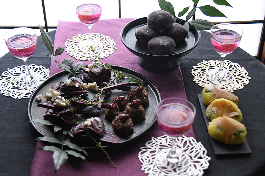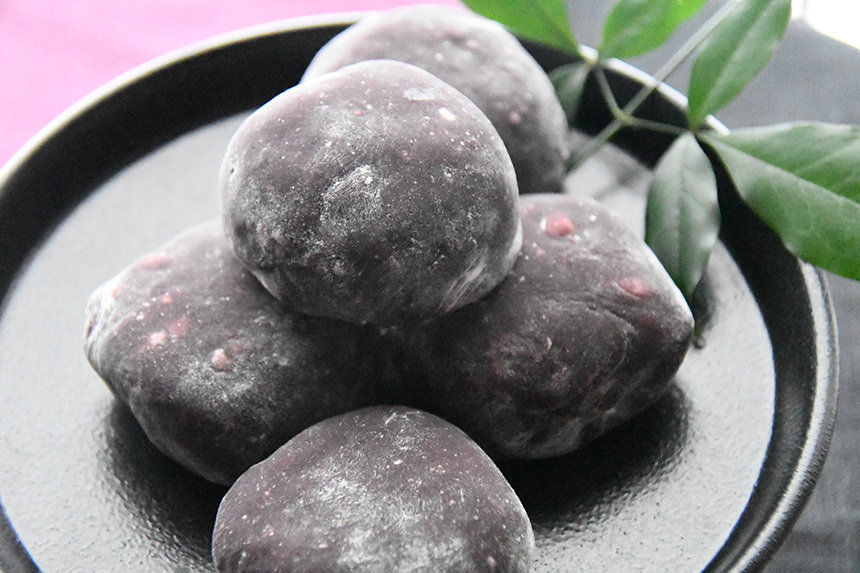 黒米の紫饅頭を高台皿に盛り付け、特別感を演出します。