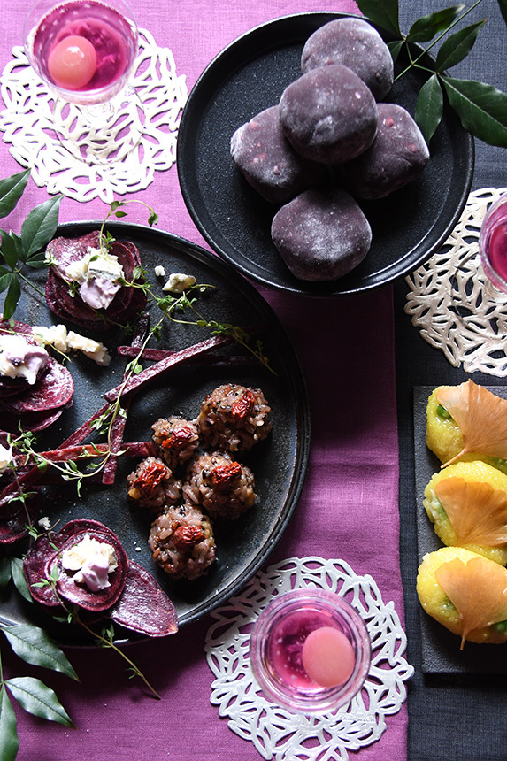 ぽってりとしたお饅頭を高台皿に盛ることで、テーブルに立体感が生まれます。また、黒米で作られた紫饅頭の特別感が演出されます。