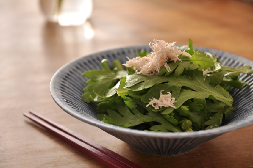 春菊はお鍋の時に活躍する野菜ですが、生でいただくとめっちゃ美味しいです。 茹でた時より、香りは穏やか、えぐみもありません。「あれ?春菊ってこんな味だっけ?」というくらい、驚きがありますよ。ぜひ、サラダに!