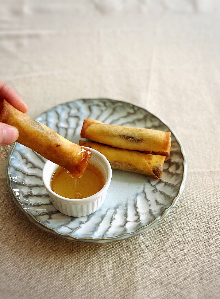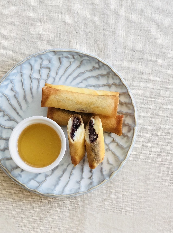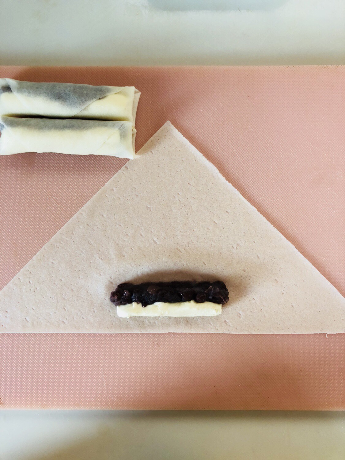 春巻きの皮にあんことクリームチーズを1/10ずつのせて巻き、巻き終わりをのりでとめる。