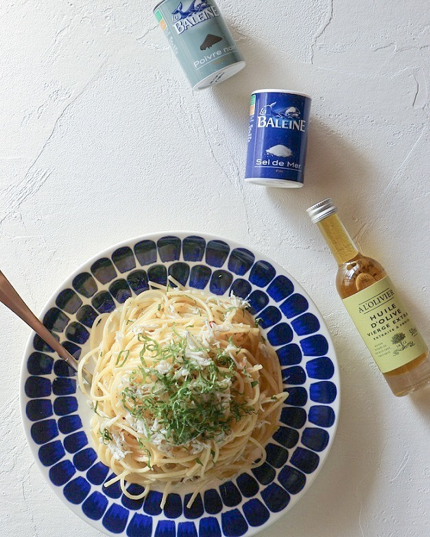 - しらす・梅干しを加え軽く混ぜ、スパゲッティを加え空気を含まるように混ぜ合わせる。味をみて塩・こしょうで味を調える。