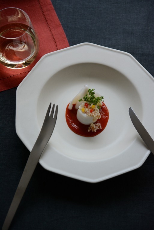 器にソースを敷き、クスクスを詰めたいかと、げそを置き、 ブロッコリースプラウトを飾る。 仕上げにオリーブオイルをかける。